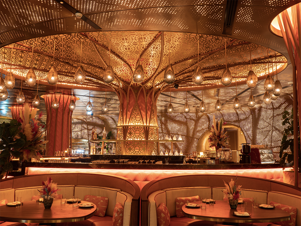 Located on the glistening Persian Gulf coastline inside the new Waldorf Astoria Lusail in Qatar’s Entertainment City, SUSHISAMBA Doha features the brand’s signature restaurant and the first Beach Club. Transporting the guest to a dream-like escape, the venue is a spectacle of light with an incredible day-to-night transformation. The tree-like, three-dimensional perforated walls and ceiling petals immerse guests throughout the space with theatrical patterns, while the custom Brazilian-inspired terrazzo flooring anchors the space.